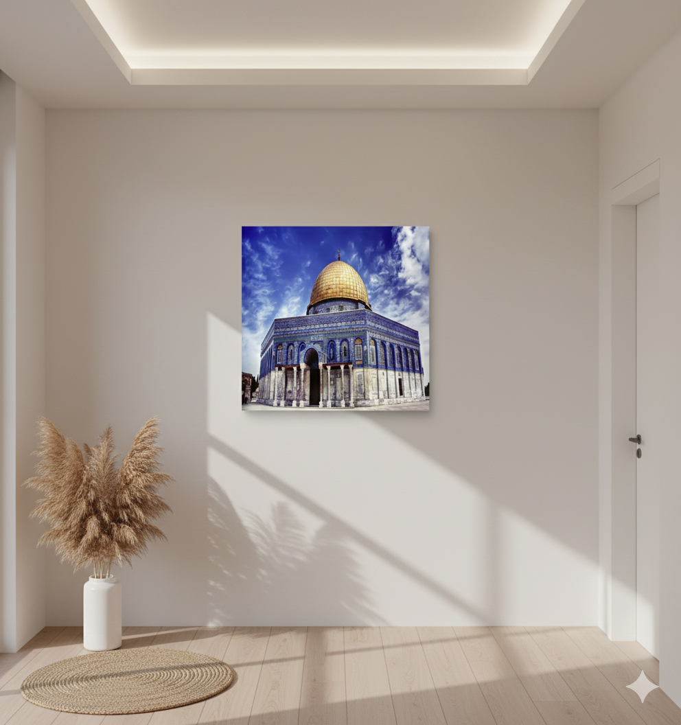 Capture the timeless beauty of one of Islam's most revered landmarks with this Dome of the Rock & Al Aqsa Mosque Canvas. This square-format artwork features a high-definition view of the golden Qubbat al-Sakhra, set against a vibrant blue sky. The detailed print highlights the intricate geometric patterns and iconic architecture that make the Al Aqsa sanctuary a spiritual focal point for millions.
