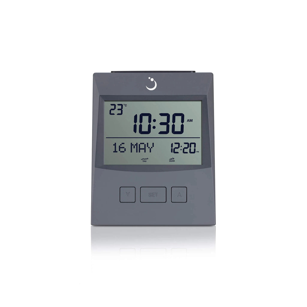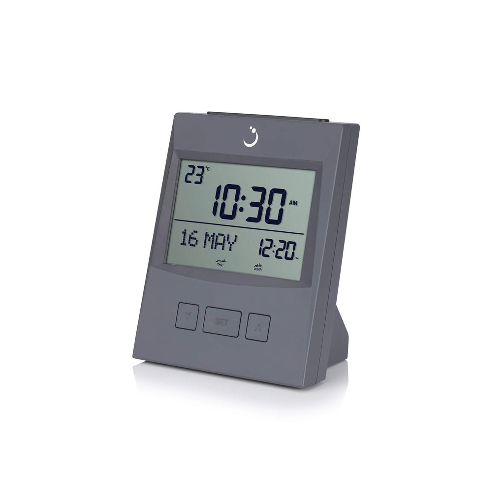 A compact, elegant table clock designed with the Muslim lifestyle in mind. The AlFajr Table Clock CS-13 features worldwide prayer times, Hijri & Gregorian calendars, Arabic/English support, full-screen light and temperature display—making it perfect for your home, office or travel companion.