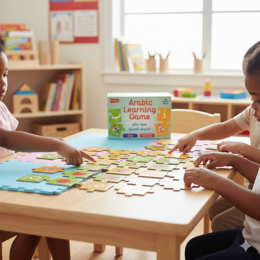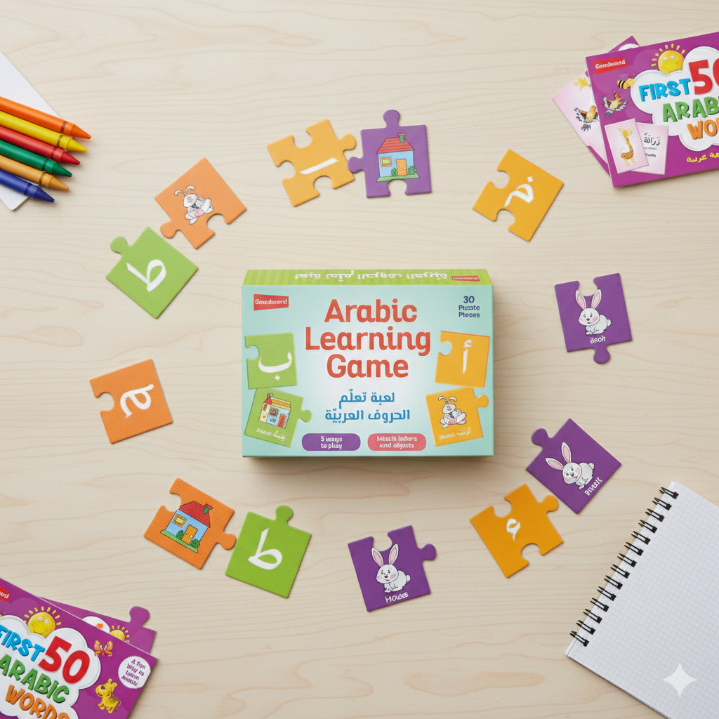 The Arabic Learning Game makes discovering the Arabic alphabet fun, interactive, and hands-on. With bright illustrations and easy-to-handle puzzle pieces, children learn to match each Arabic letter with the correct picture, helping build strong early recognition skills.