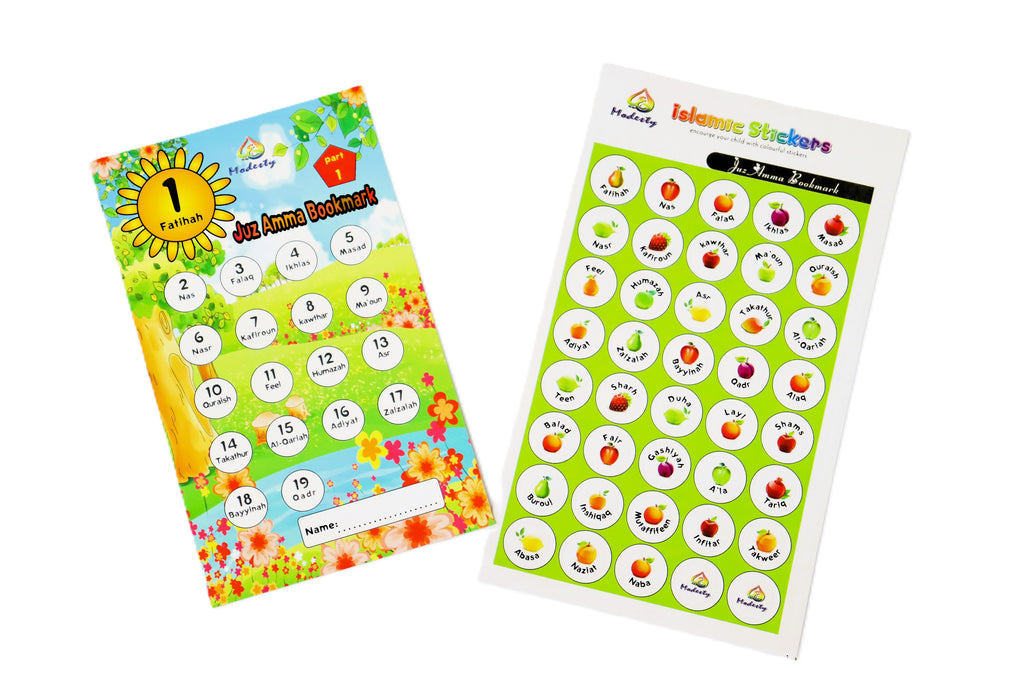 Help your child stay motivated and organised on their Qur’an memorisation journey with the Juz Amma Bookmark & Stickers by Modesty Collection. This engaging set allows children to track each Surah they memorise from Juz Amma using fun fruit-themed stickers—making learning enjoyable, visual, and rewarding.