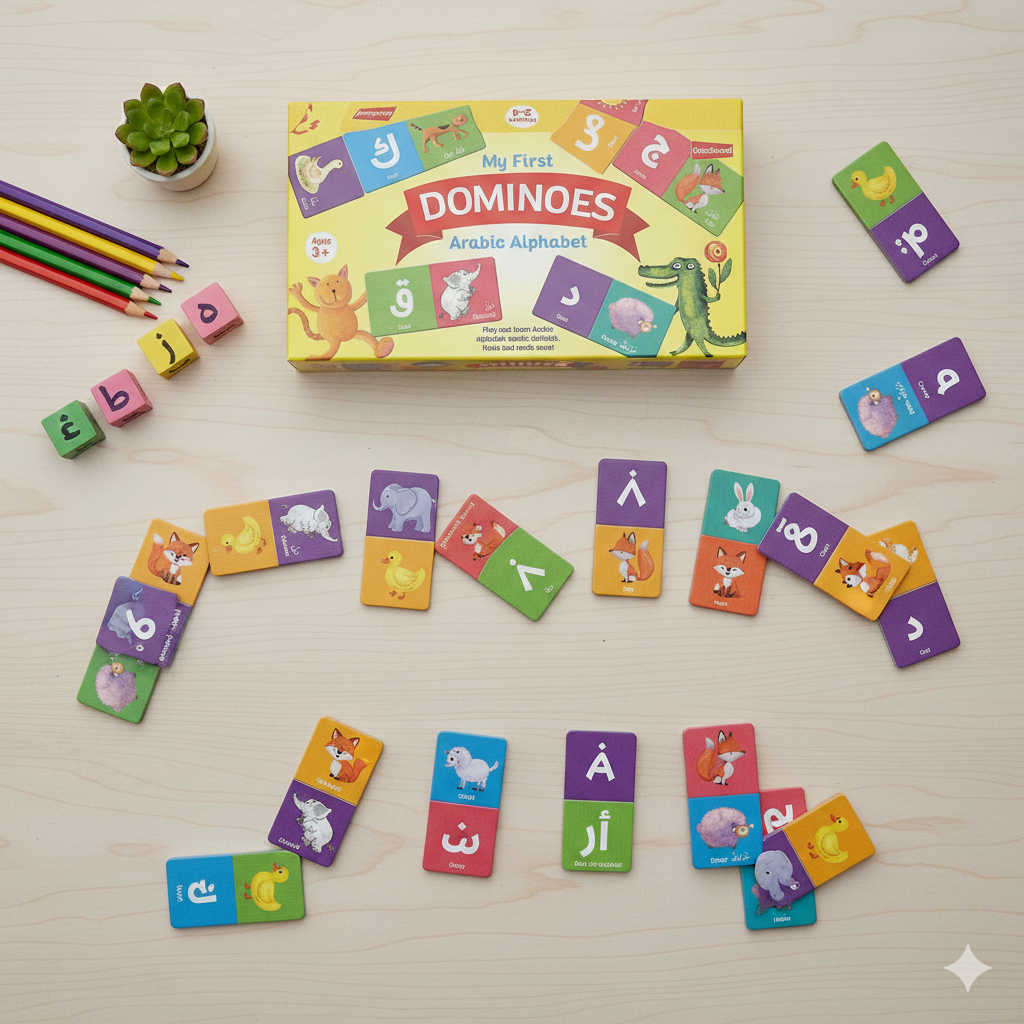 Make learning fun with My First Dominoes: Arabic Alphabet Edition! This colourful and engaging dominoes game helps children learn the Arabic alphabet, recognise words, animals, fruits, and much more—while also strengthening matching and memory skills.